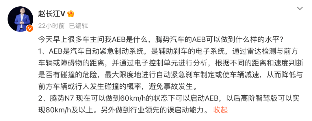 腾势销售事业部总经理赵长江表示,腾势汽车可以做到 80km/h 的状态下启动 AEB,明年做到 100km/h。