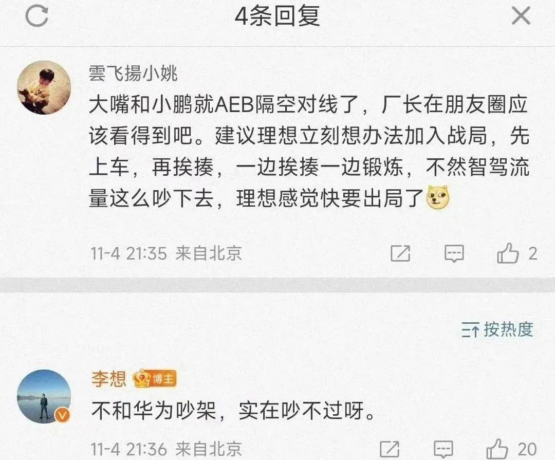 看热闹不嫌事大的李想,“不和华为吵架,实在吵不过呀”,难道跟小鹏不在话下?