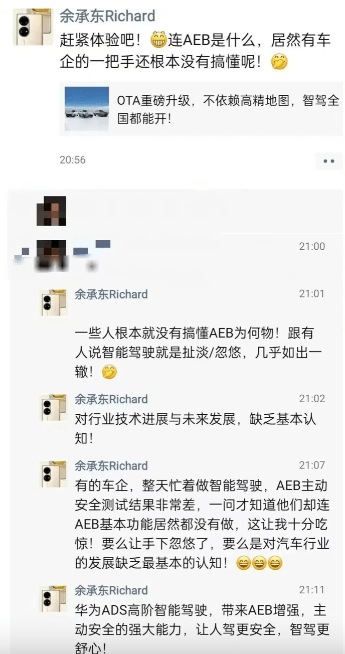 如此“泼天脏水”,终于激怒了余承东,他在朋友圈转发了一篇名为《OTA重磅升级,不依赖高精地图,智驾全国都能开》文章,并开启狂轰滥炸模式: