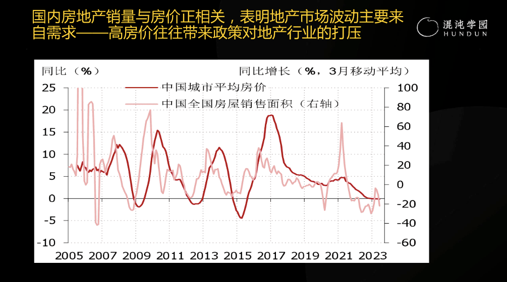 第一个例子,中国的房地产市场。图里是中国城市的平均的房价同比涨幅,以及我们房屋销售面积的同比涨幅。很显然,在过去十几年,二者是显著的正相关的,意味着中国房地产市场的波动主要来源是需求面因素。大家也能感受到,在过去这些年,我们房地产市场需求面的调控政策是主导性的。这也表明,中国房地产市场里供给面的波动是比较小的,这是我们的土地制度带来的。