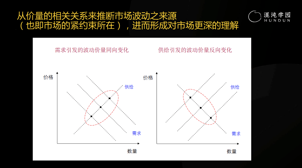 如果市场里面的波动,是来自于需求面,需求曲线在平移。价涨量涨,价跌量跌,是需求在主导市场波动的一个显著特征。反过来,如果供给是市场上波动的主导性因素,供给曲线在平移。这时候价涨量跌,价跌量涨。所以我们去看任何一个市场,或者看整个宏观经济,你第一步要看的是看这个市场价量的配合,如果是价量同向变化,需求面是重要的,价量反向变化,供给面是重要的。
