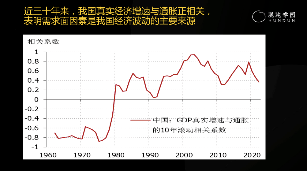 看中国经济到底是应该从需求面还是从供给面去入手呢?同样的,我们来看价量的配合。这张图是中国GDP的真实增速,与我们的通胀的增速之间的滚动相关系数。