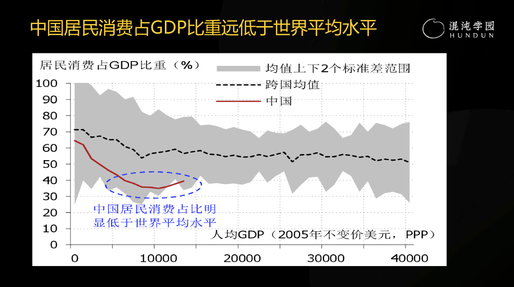 参照这张图,我们在经济发展方面取得了长足的进步。但同时我们要看到,在这几十年的发展过程中,我们居民消费占GDP比重,整体来看趋势下降,近些年有所回升,但绝对水平仍然很低,大概只有40%。