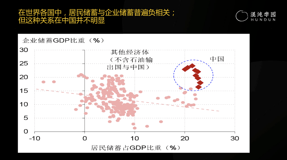 现在我们把中国放上去。图中深色的菱形就是我们的中国,你发现中国企业储蓄、居民储蓄都很高,而且企业储蓄与居民储蓄之间缺乏一种负相关的关系,这表明什么?这表明在其他国家普遍存在的,在居民与企业部门之间的这种财富效应的联系,在中国是缺失的。