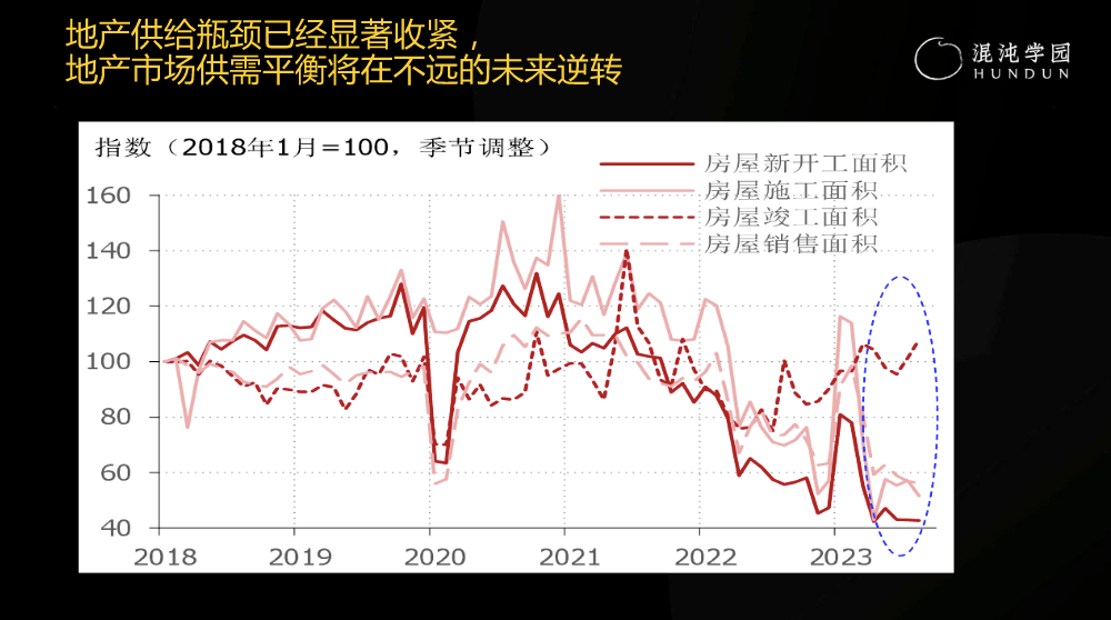 来看这张图,三条红线政策推出以来,如果把现在的绝对水平和2020年末的绝对水平做个对比,你会发现,新开工面积已经下降了2/3,在建面积下降1/2,销售面积下降1/2,只有一个指标相当好,竣工面积,现在甚至比2020年年末还要高一点。为什么呢?因为开发商资金链很紧的时候,要加速地修完房子,加速竣工,加速推盘,来回笼资金。