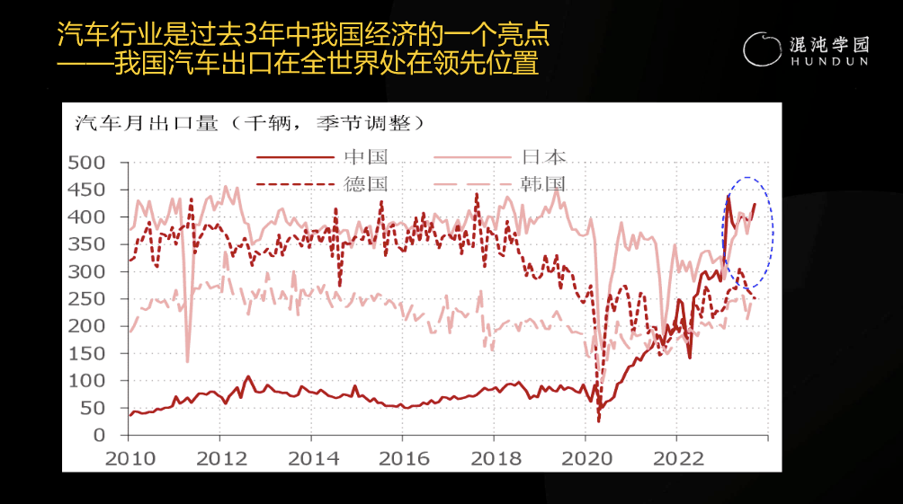 在过去三年,中国经济也有个非常明显的亮点,就是中国的汽车行业。在2020年上半年,中国的汽车出口量,跟其他三个国家相距差距还是比较大的。但到今年,中国汽车出口量已经是全球第一了,这是一个历史性的突破。因为我们的新能源转型,电动车和插电混动车在乘用车产量中的比重,从2020年不到5%,到现在的30%以上。