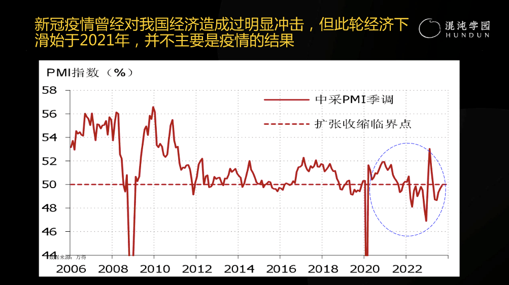 我们能看到,疫情对经济是有明显冲击的。但此轮经济景气的下滑趋势始于2021年,2021年我们国内疫情控制得很不错,所以这一轮经济下行的压力主要不是疫情带来的。很自然的,在疫情结束之后,你会发现经济压力还是很大。