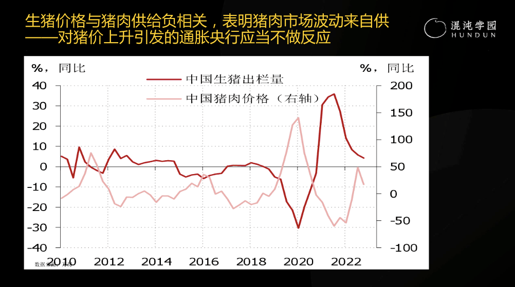 另一个例子,中国的猪肉市场。猪肉在我们整个居民消费的盘子里面,是占比最大的一个单一商品,而且价格经常性地波动会很大。你会发现消费者所感受到的通胀水平,经常性地被猪肉所主导。比如说,大概在2019年、2020年,猪肉价格涨幅是非常高的,猪肉价格很高的涨幅会带来CPI通胀的上涨。那么央行作为调控通胀的主要政府机构,该怎么应对?