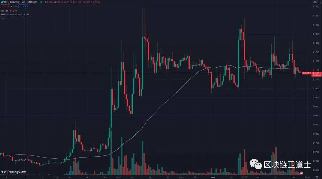 基于RSK,IOV Labs进一步开发了RIF (Rootstock Infrastructure Framework),包括操作系统、域名服务、中继和钱包等基础设施,旨在帮助开发者通过API和语言库更快更好地构建DApp。$RIF是其原生代币,在本轮上涨中率先翻倍,币安也顺势上线了RIF的永续合约。尽管经历了一波大幅上涨,RIF的市值仅有1.1亿美元,向上空间不容小觑。