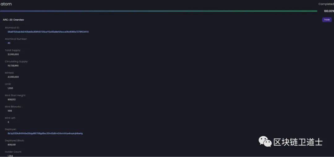 作为Atomicals协议最简单的玩法,多个ARC-20代币已经被社区成员铸造完成。其中$ATOM是第一个诞生的ARC-20代币,成为Atomicals协议的代表性代币。其总量为2100万个,目前在$ATOM价格达到了$1.55,总市值约为3000万美元。对标$ORDI超过4亿美元的市值,$ATOM的想象空间巨大。