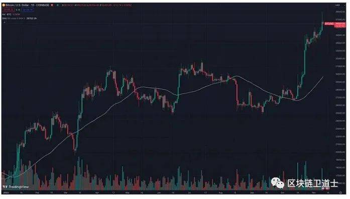 10月16日,Cointelegraph报道了关于SEC批准现货ETF的假消息,BTC一度向上插针至$30000附近,但市场并未因此完全回撤,而是在MA120附近盘整,而后继续上涨。显然,我们正处于“人心思涨”的阶段,市场做多的情绪已经被点燃。