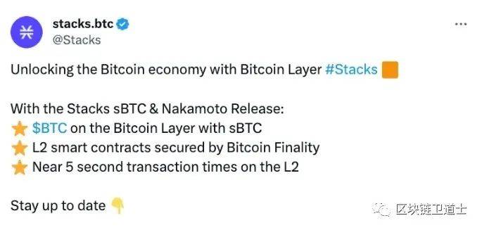 10月20日,Stacks发布了sBTC开发者版本,可供开发人员开始构建使用sBTC的应用程序,以及测试存款和取款等基本功能。sBTC是Stacks层上1:1对应BTC 的资产,可访问智能合约,用于DeFi和NFT等应用。Stacks计划于2024年第一季度发布Nakamoto升级,大幅提升网络的安全性和运行速度。