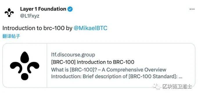 10月25日,BRC-20开发者@domodata成立的基金会Layer 1 Foundation发布了BRC-100的介绍。BRC-100是一种基于序数理论的可扩展的去中心化计算协议,专为直接在比特币第一层上的去中心化应用程序设计,例如DeFi、SocialFi、GameFi等。BRC-100从BRC-20扩展而来,并且可以扩展和改进,为基于比特币第一层的应用创造可能性。