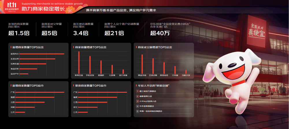 今年以来,京东通过“春晓计划”不断降低了商家入驻门槛和运营成本,带动了大量中小微商家入驻京东。在京东11.11期间,新注册店铺数量同比去年同期增长3.4倍,而今年参加京东11.11的新老商家总数较去年同期增长超1.5倍。