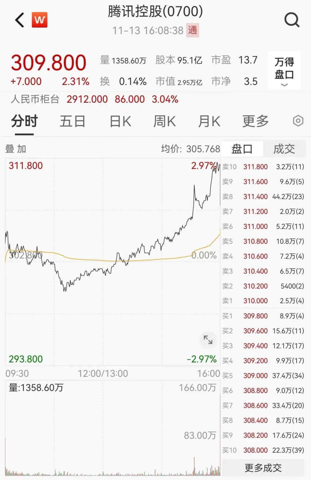11月13日,腾讯控股一度大涨2.97%,全天涨2.31%,收报309.8港元。