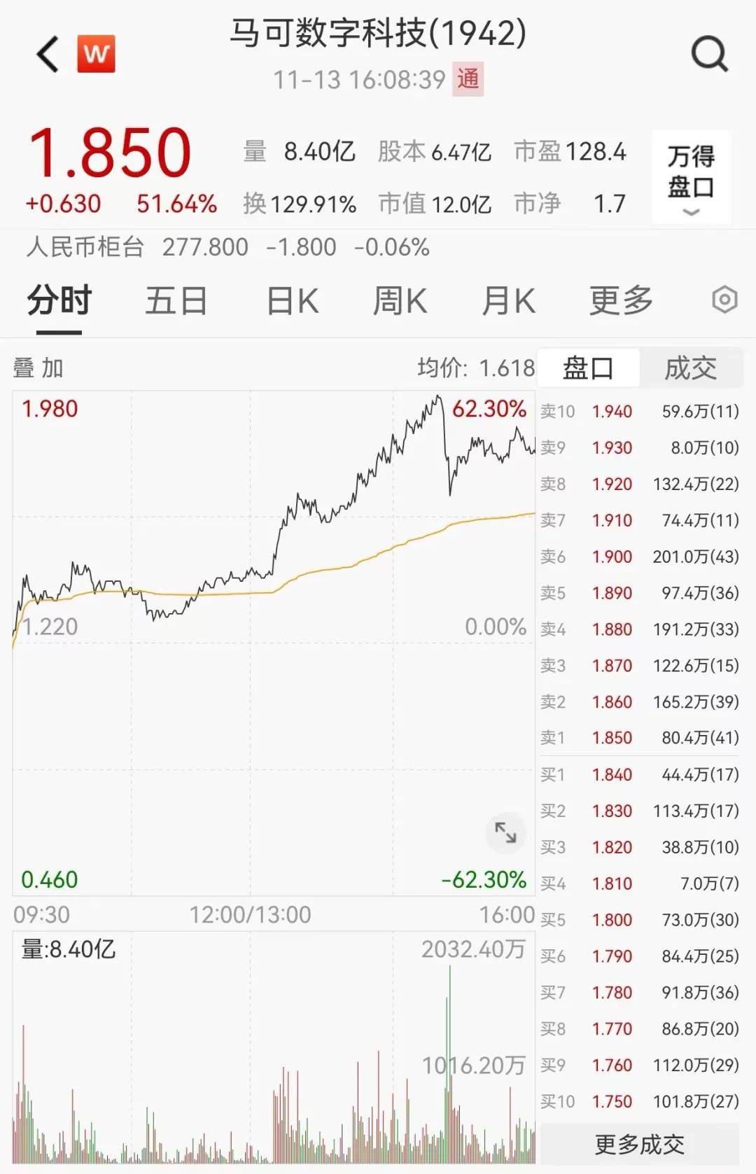 11月13日,马可数字科技开盘后一路狂飙,最高涨幅达62.30%,最终收于1.85港元,涨51.64%,领涨港股。此前,公司公告称,附属公司中保科创数字人民币综合技术服务平台与工商银行总行已成功实现系统对接。