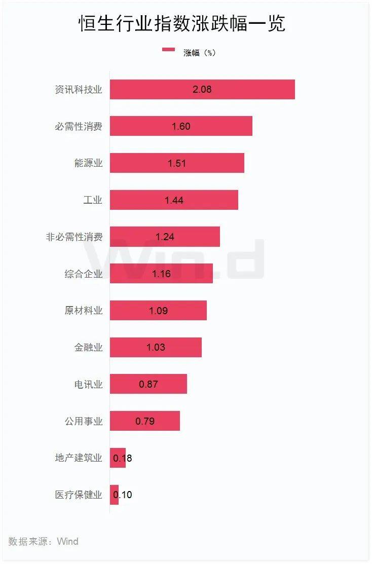 从行业表现看,恒生行业指数日内全线上涨,资讯科技业涨2.08%,必需性消费涨1.6%,能源业涨1.51%。
