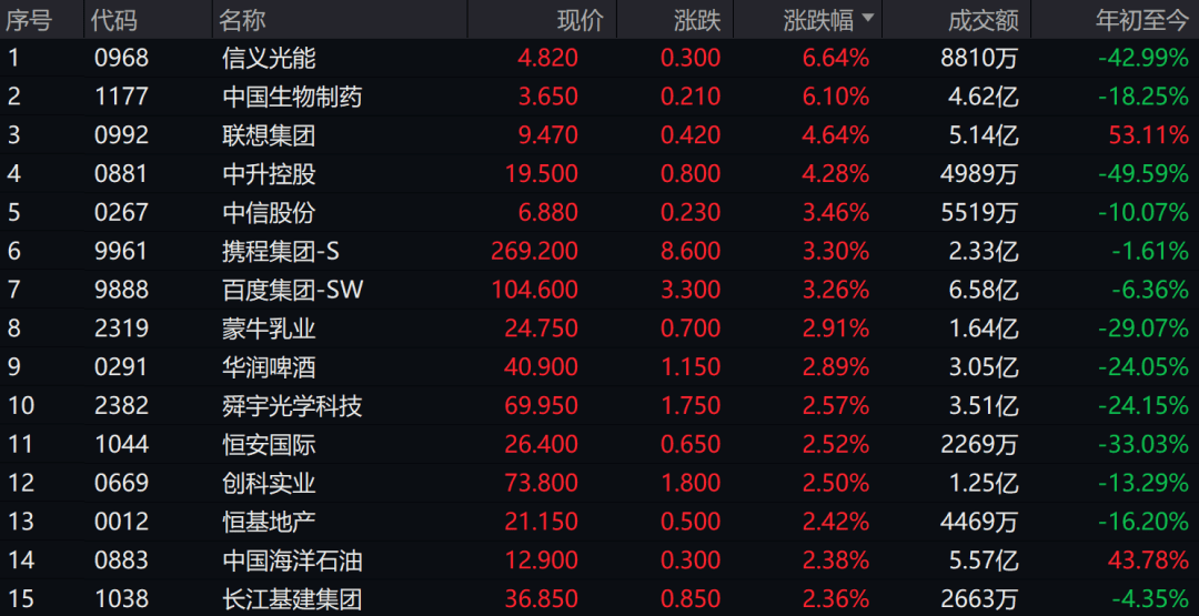 个股方面,信义光能涨6.64%,中国生物制药涨6.10%,联想集团涨4.64%,领涨蓝筹股。
