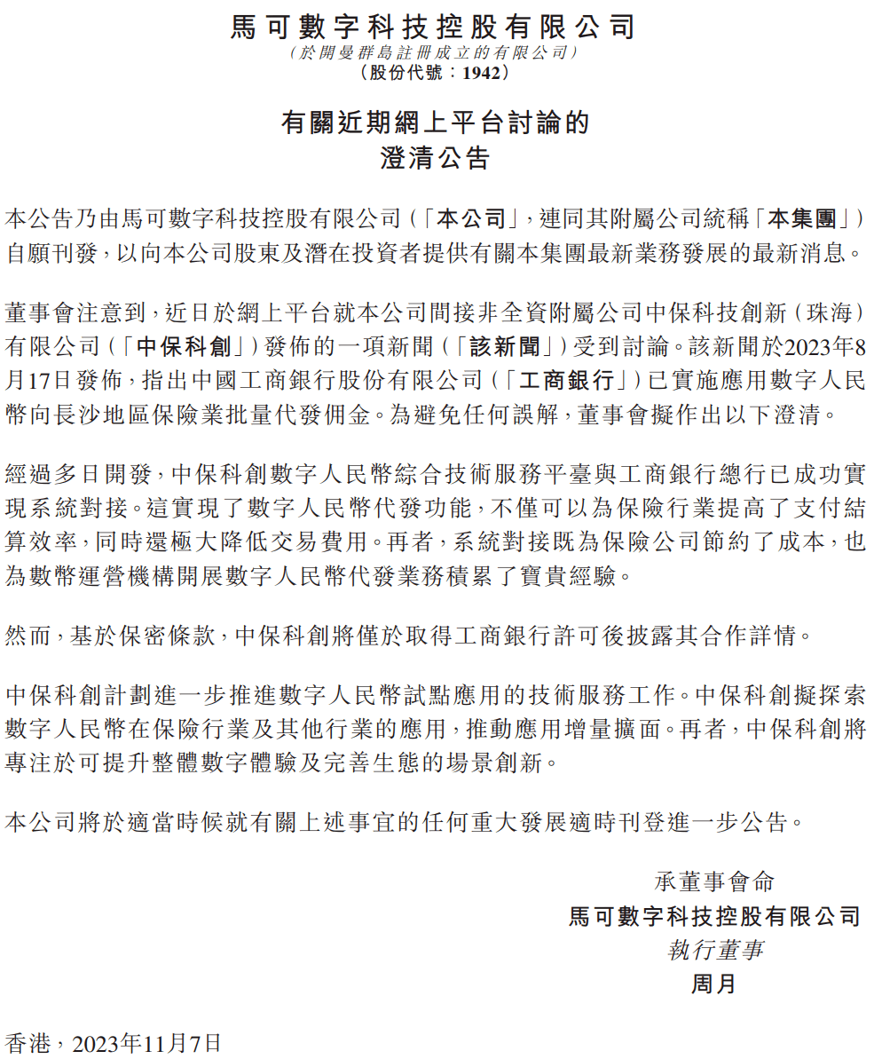 11月7日,马克数字科技发布公告称,董事会注意到,近日于网上平台就本公司间接非全资附属公司中保科技创新(珠海)有限公司(中保科创)发布的一项新闻受到讨论。该新闻于2023年8月17日发布,指出中国工商银行股份有限公司(工商银行)已实施应用数字人民币向长沙地区保险业批量代发佣金。