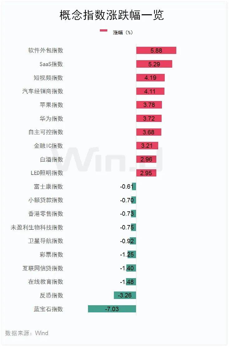 从盘面来看,Wind概念板块多数上涨,软件外包指数涨5.88%,SaaS指数涨5.29%,短视频指数涨4.19%。跌幅方面,蓝宝石指数领跌7.03%,反恐指数跌3.26%,在线教育指数跌1.48%。