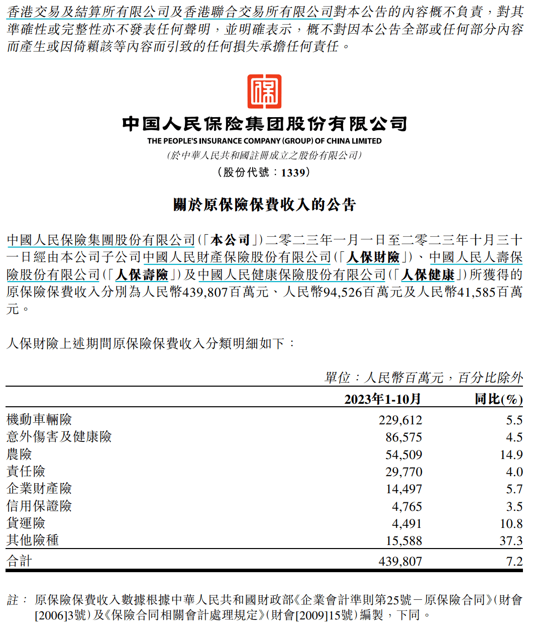 11月13日,中国人民保险集团在港交所发布公告称,1-10月经由公司子公司人保财险、人保寿险及人保健康所获得的原保险保费收入分别为4398.07亿元、945.26亿元及415.85亿元,分别同比增长7.2%,9.9%和9.0%。