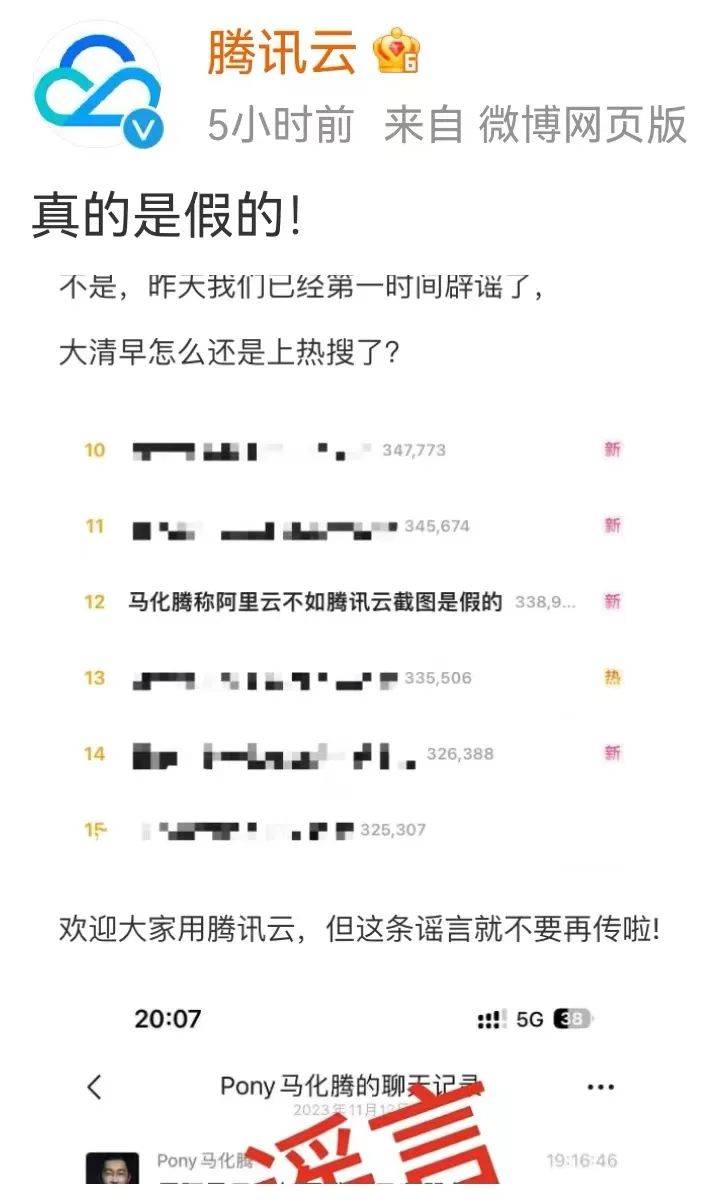 另外,11月13日,一则关于马化腾称“用阿里云不如用腾讯云”的虚假截图把腾讯推上热搜。
