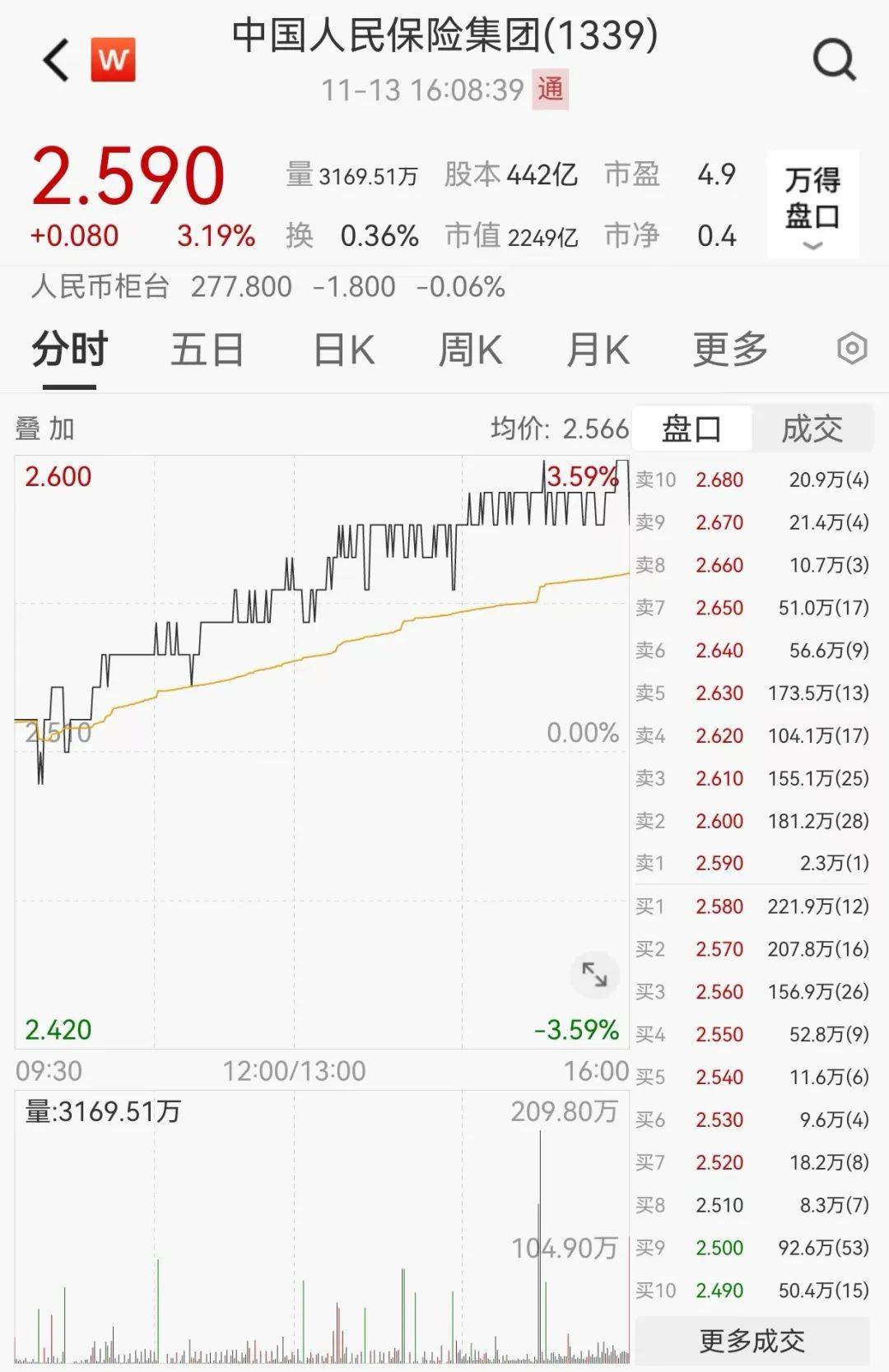 11月13日,中国人民保险集团股价开盘一路上涨,最高涨幅达3.59%,全日收于2.59港元,涨3.19%。