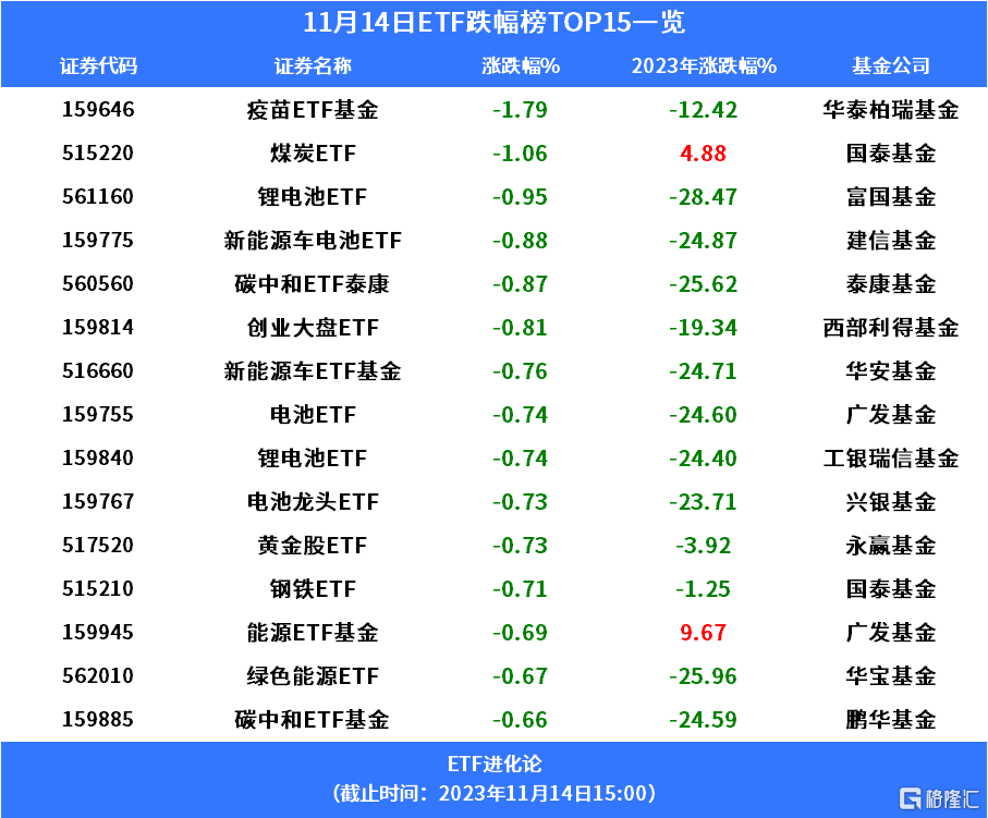 煤炭板块跌幅居前,煤炭ETF跌1.06%。新能源赛道股全线下挫,锂电池ETF和新能源车电池ETF分别跌0.95%和0.88%。贵金属板块走弱,黄金股ETF跌0.73%。