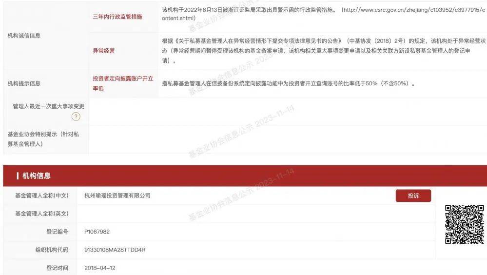 中国基金业协会披露信息显示,汇盛私募已被提示注册地与办公地不在同一辖区,杭州瑜瑶2022年6月曾被浙江证监局采取出具警示函的行政监管措施,已被判定为异常经营。