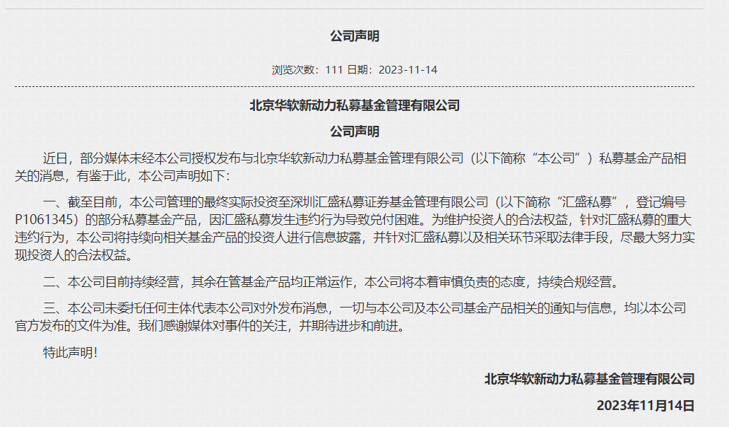 刚刚,华软新动力公司在官网发布声明称,公司管理的最终实际投资至汇盛私募的部分私募基金产品,因汇盛私募发生违约行为导致兑付困难。为维护投资人的合法权益,针对汇盛私募的重大违约行为,本公司将持续向相关基金产品的投资人进行信息披露,并针对汇盛私募以及相关环节采取法律手段,尽最大努力实现投资人的合法权益。