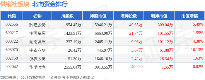 北向资金方面,当日供销社板块北向资金持股市值为2.7亿元,增持601.48万元。其中增持最多的是辉隆股份,增持了309.04万元。供销社板块北向资金持股变动明细见下表: