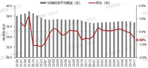 图:2021年6月至2023年11月50城住宅平均租金及环比变化