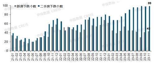图:2021年1月至2023年11月百城新建及二手住宅价格环比下跌城市数量