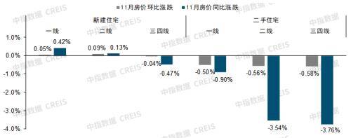 根据中国房地产指数系统百城价格指数,新建住宅方面,11月一线及二线城市房价同比上涨,涨幅分别为0.42%和0.13%。三四线代表城市房价同比下跌0.47%,梯队内近8成城市房价同比下跌。