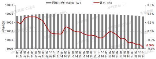 图:2021年1月至2023年11月百城二手住宅价格及环比变化