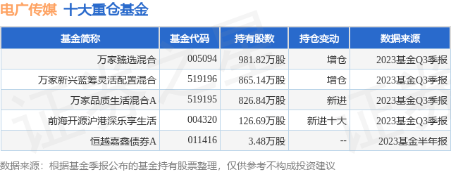 根据2023基金Q3季报公募基金重仓股数据,重仓该股的公募基金共4家,其中持有数量最多的公募基金为万家臻选混合。万家臻选混合目前规模为15.31亿元,最新净值2.2184(11月30日),较上一交易日上涨0.29%,近一年下跌17.23%。该公募基金现任基金经理为莫海波。莫海波在任的基金产品包括:万家和谐增长混合A,管理时间为2015年5月6日至今,期间收益率为114.99%;万家品质生活混合A,管理时间为2015年8月6日至今,期间收益率为213.13%;万家新兴蓝筹灵活配置混合,管理时间为2016年1月26日至今,期间收益率为200.71%;