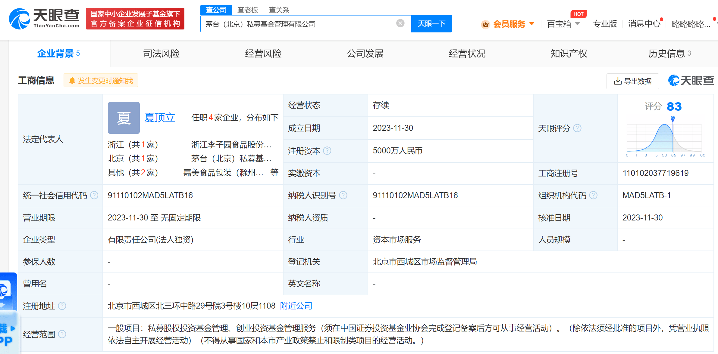 天眼查App显示,近日,茅台(北京)私募基金管理有限公司成立,法定代表人为夏顶立,注册资本5000万人民币,经营范围为私募股权投资基金管理、创业投资基金管理服务。股权全景穿透图显示,该公司为茅台(贵州)私募基金管理有限公司全资子公司,后者由中国贵州茅台酒厂(集团)有限责任公司和建信(北京)投资基金管理有限责任公司共同持股。