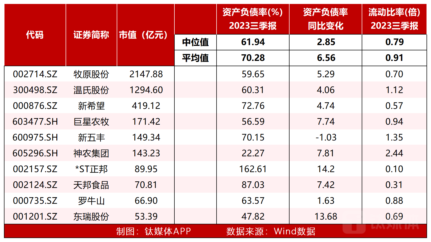 的确,猪价磨底的行情下,大型猪企用实际行动表现出战到最后一刻的决心。据wind数据,十大猪企平均资产负债率达70.28%,除新五丰外均较去年大幅上涨,其中东瑞股份、*ST正邦资产负债率都同比增长了超过10个百分点,七成猪企的流动比率(流动资产/流动负债)也小于1,这意味着短期内他们都面临着较大的偿债压力。
