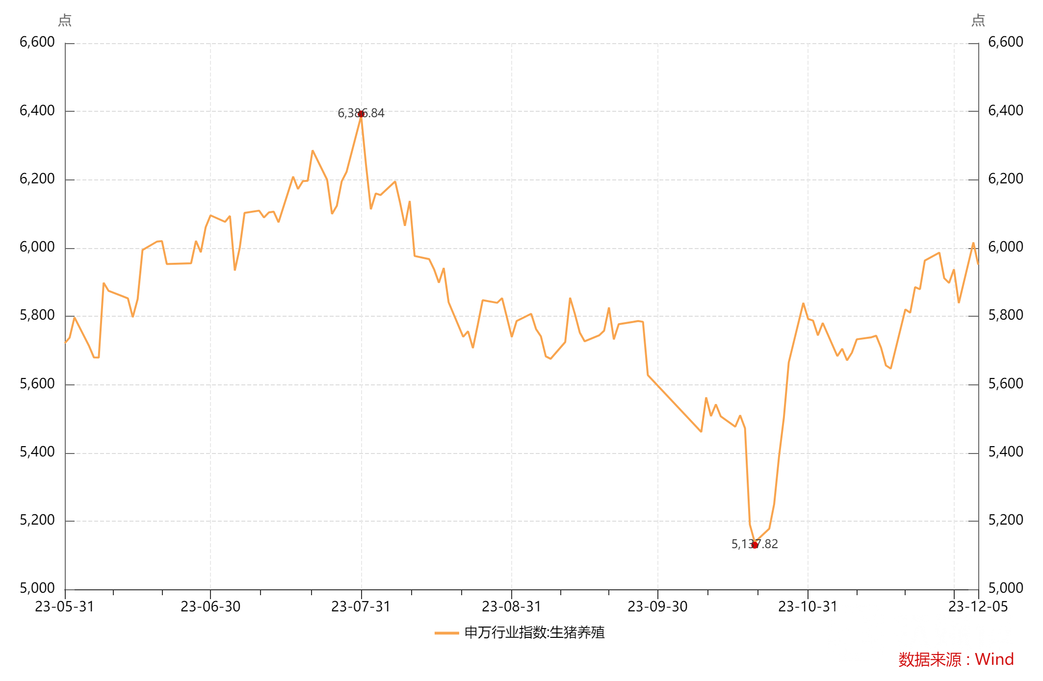 12月6日,猪肉概念股集体飘红,益生股份涨停,巨星农牧涨超7%,唐人神、神农集团涨超6%,天康生物、华统股份、*ST正邦、东瑞股份等多股涨超5%。猪肉股反弹并不是偶然,实际上,从十月下旬,生猪养殖(申万)板块就已经开始走高。